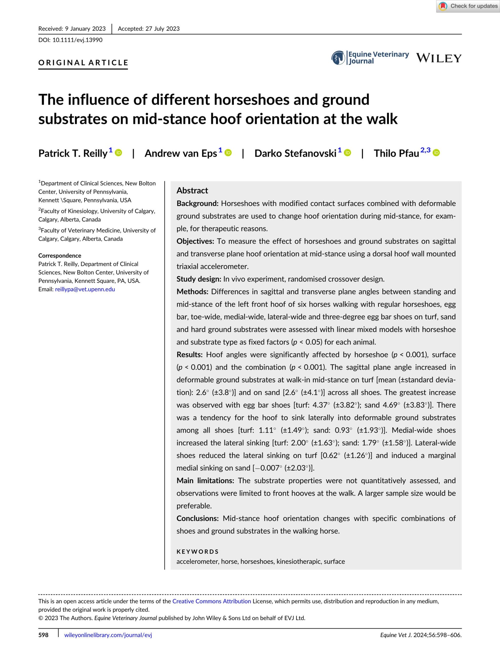 - Reilly. P. T. et al., The Influence of Different Horseshoes and Ground Substrates on Mid‐stance Hoof Orientation at the Walk. Equine Veterinary Journal. 2024. View Summary