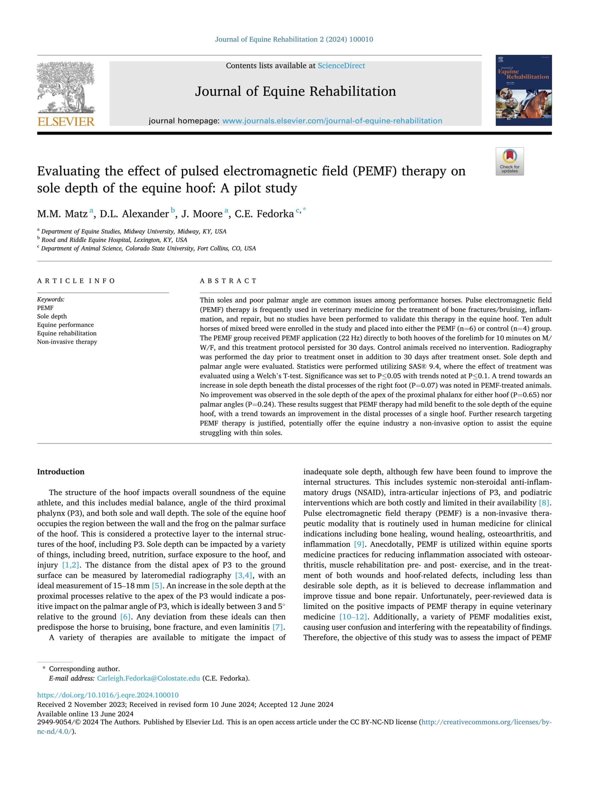 - Matz. M. M. et al., Evaluating the Effect of Pulsed Electromagnetic Field (PEMF) Therapy on Sole Depth of the Equine Hoof: A Pilot Study. Journal of Equine Rehabilitation. 2024.