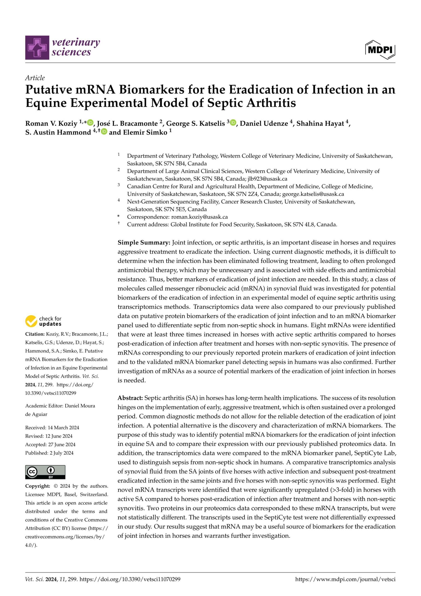 - Koziy. R. V. et al., Putative mRNA Biomarkers for the Eradication of Infection in an Equine Experimental Model of Septic Arthritis. Veterinary Sciences. 2024. View Summary
