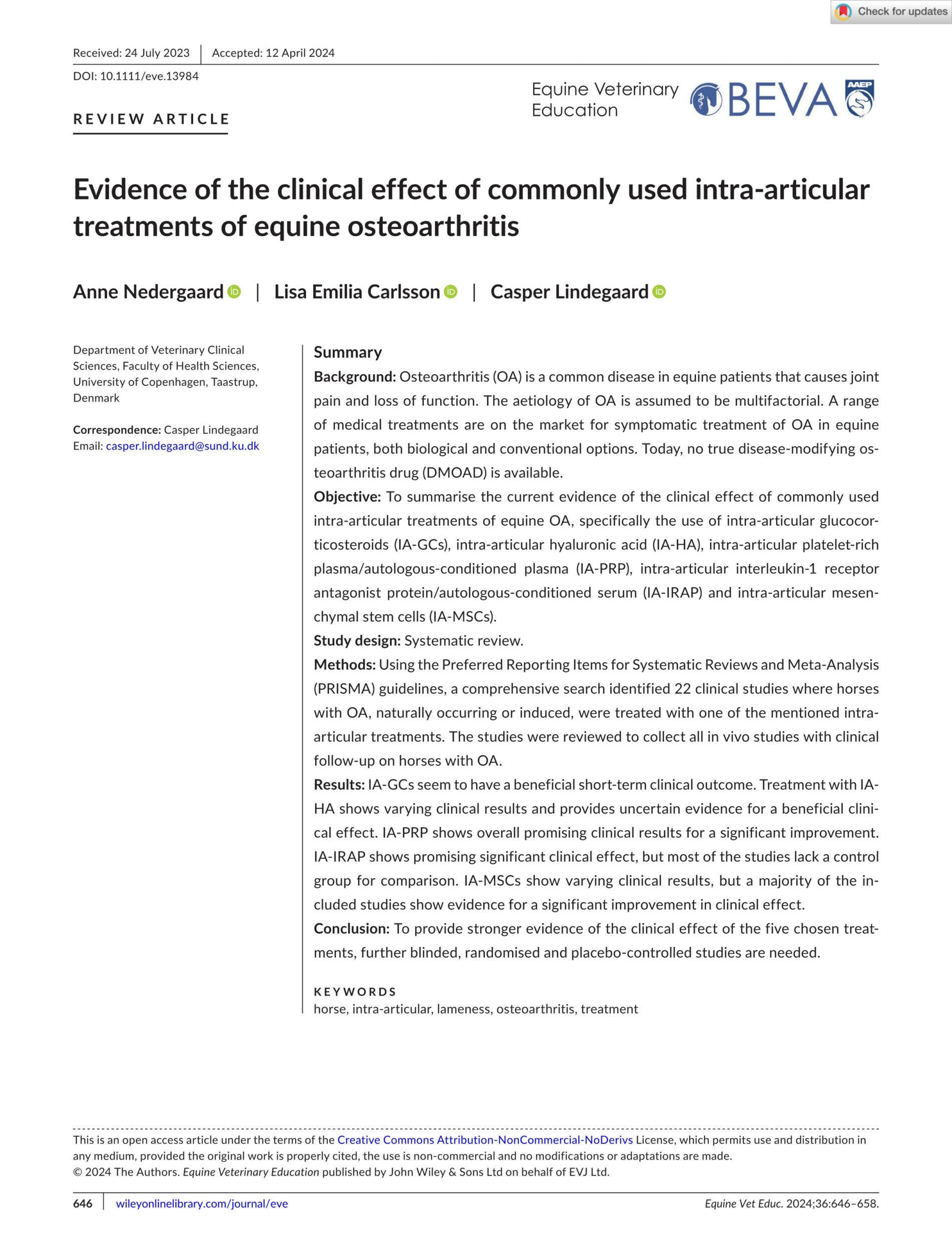 - Nedergaard. A. et al., Evidence of the Clinical Effect of Commonly Used Intra‐articular Treatments of Equine Osteoarthritis. Equine Veterinary Education. 2024.