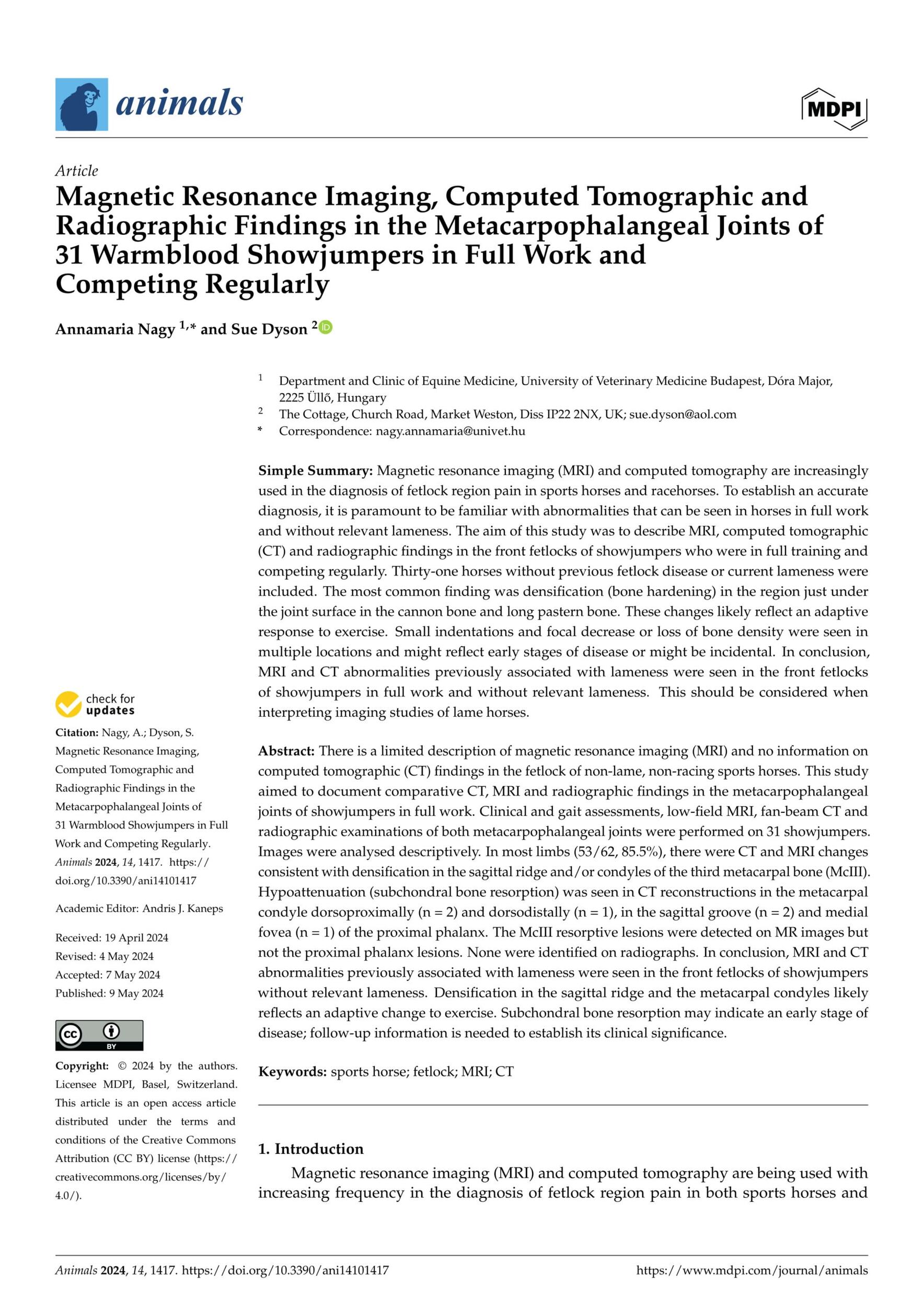 - Nagy. A. and Dyson. S., Magnetic Resonance Imaging, Computed Tomographic and Radiographic Findings in the Metacarpophalangeal Joints of 31 Warmblood Showjumpers in Full Work and Competing Regularly. Animals. 2024. View Summary