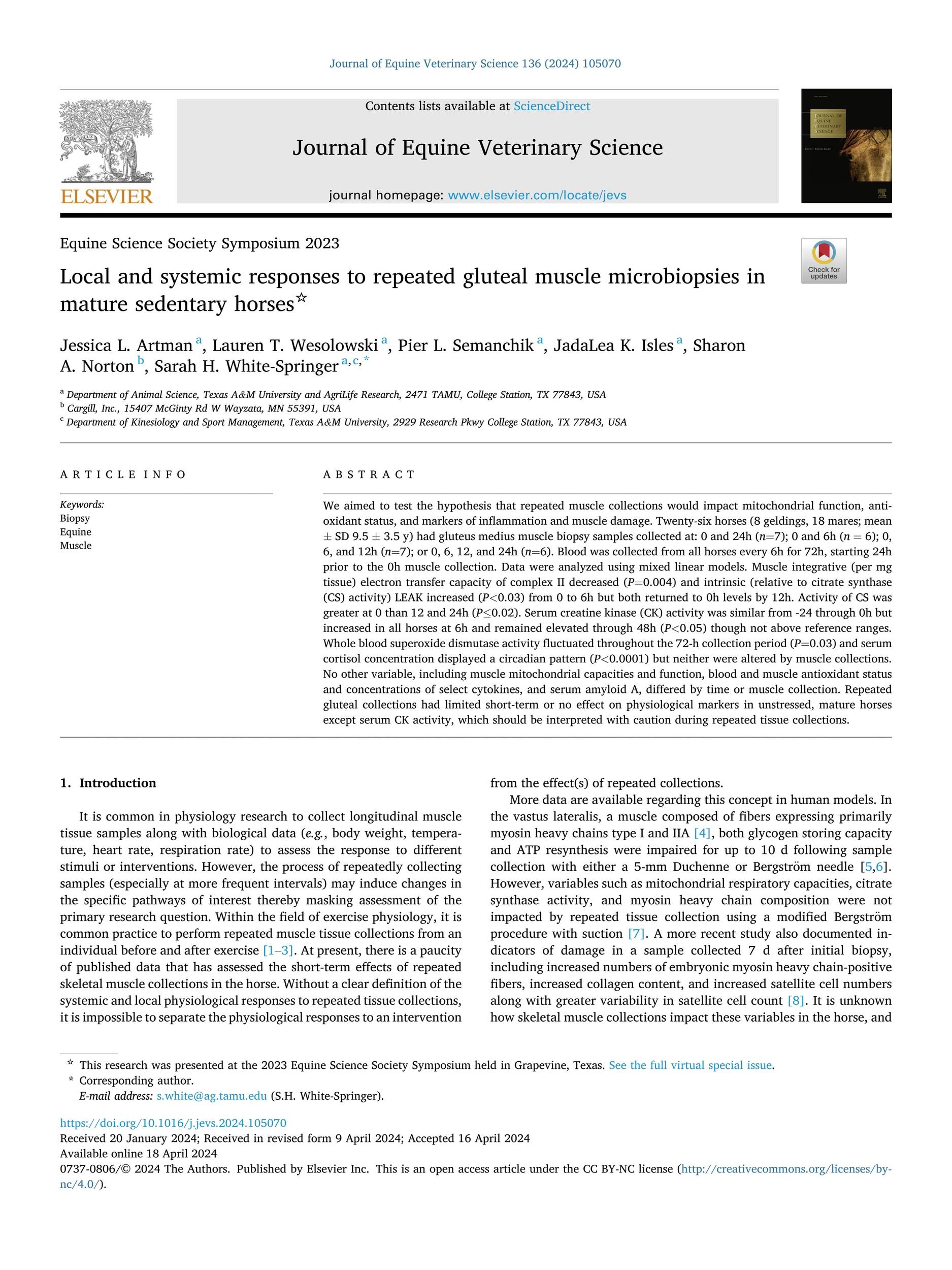 - Artman. J. L. et al., Local and Systemic Responses to Repeated Gluteal Muscle Microbiopsies in Mature Sedentary Horses. Journal of Equine Veterinary Science. 2024. View Summary
