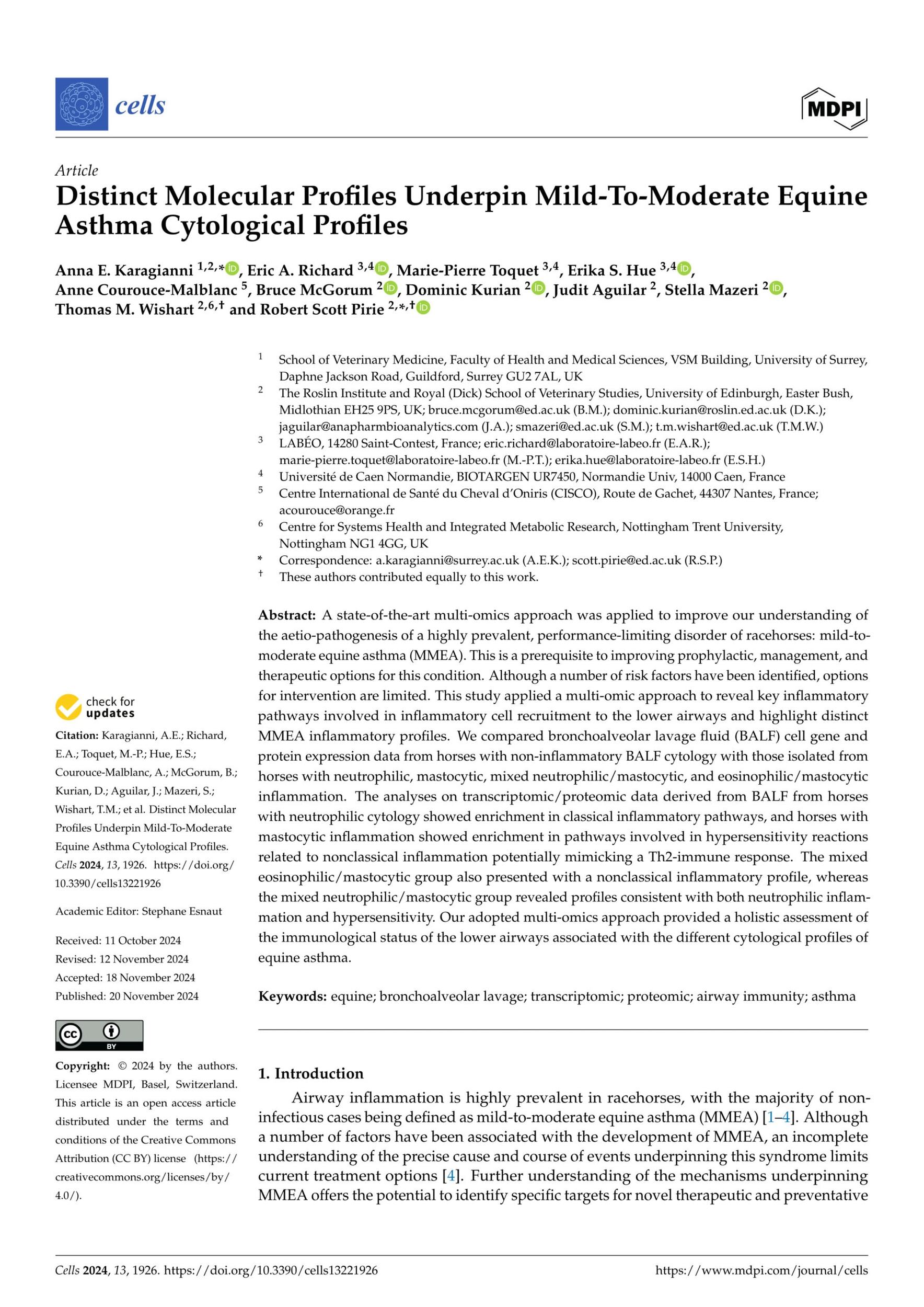 - Karagianni. A. E. et al., Distinct Molecular Profiles Underpin Mild-To-Moderate Equine Asthma Cytological Profiles. Cells. 2024. View Summary