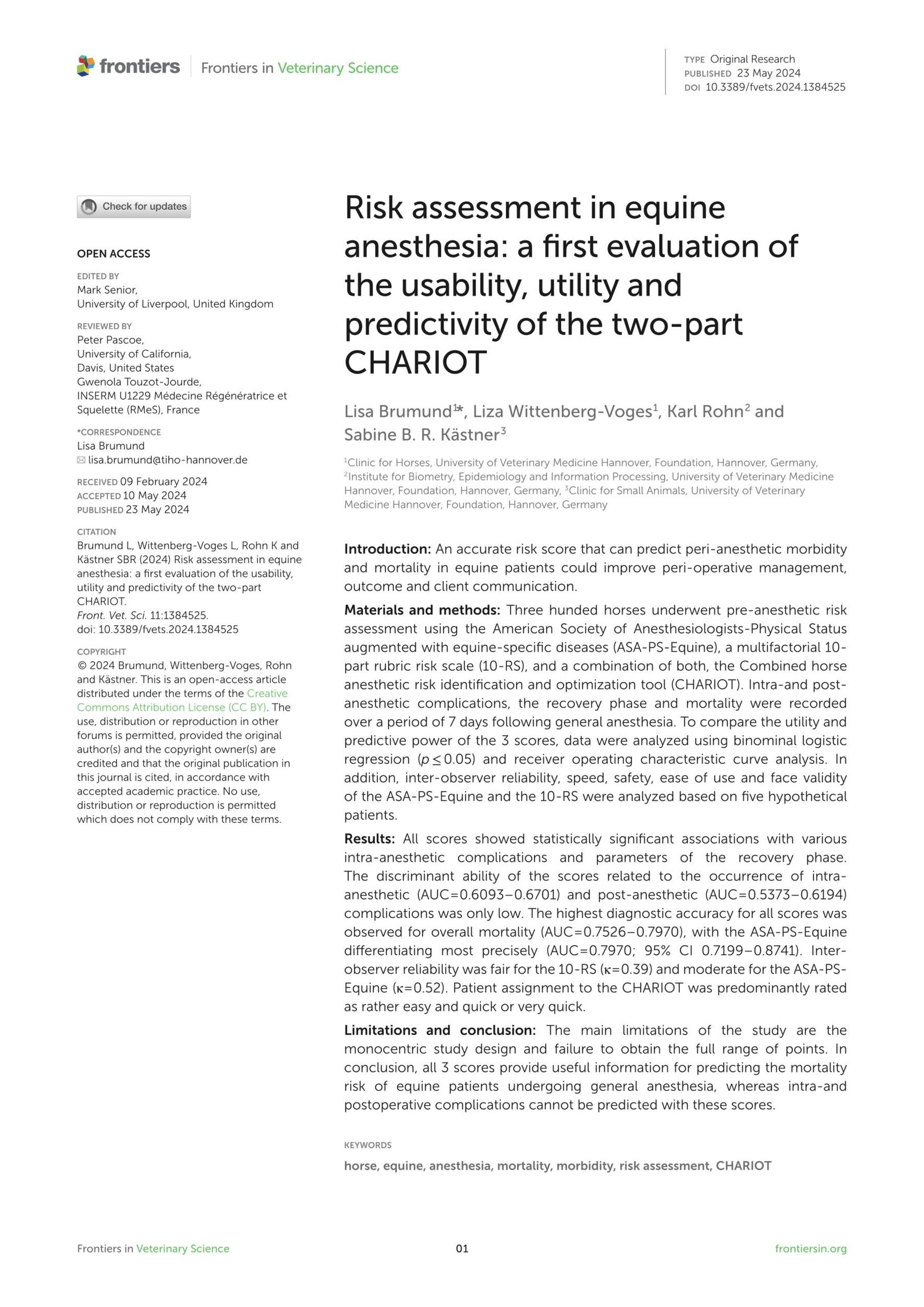 - Brumund. L. et al., Risk Assessment in Equine Anesthesia: A First Evaluation of the Usability, Utility and Predictivity of the Two-Part CHARIOT. Frontiers in Veterinary Science. 2024. View Summary