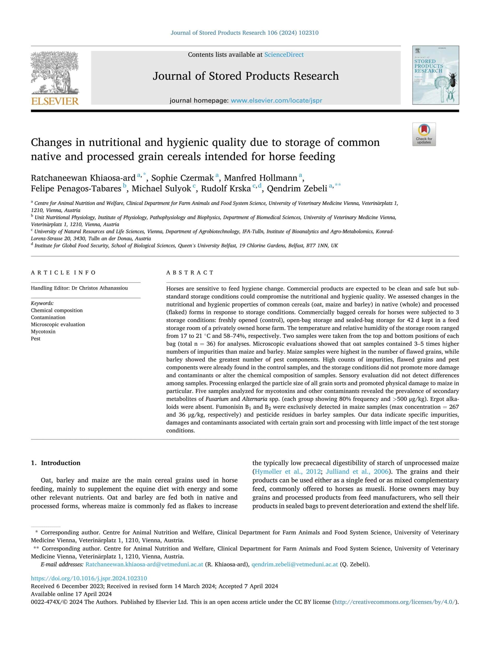 - Khiaosa-ard. R. et al., Changes in Nutritional and Hygienic Quality Due to Storage of Common Native and Processed Grain Cereals Intended for Horse Feeding. Journal of Stored Products Research. 2024.