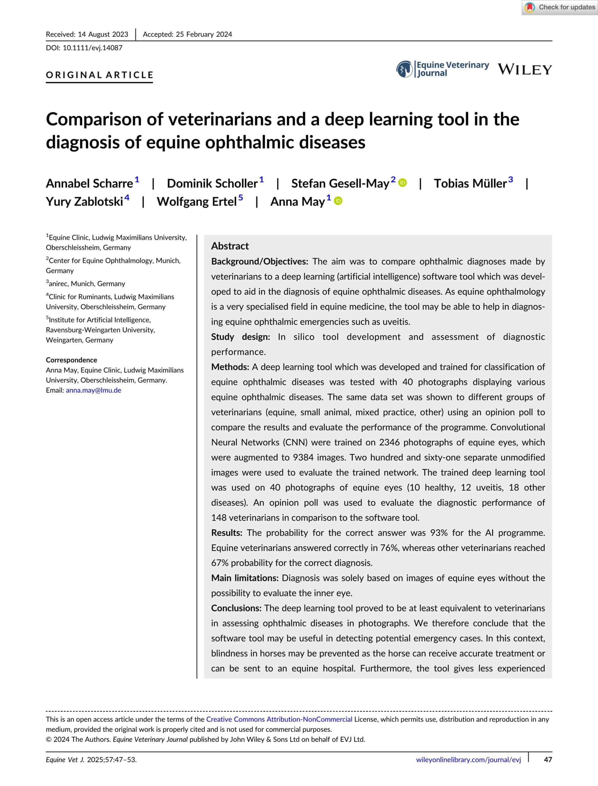 - Scharre. A. et al., Comparison of Veterinarians and a Deep Learning Tool in the Diagnosis of Equine Ophthalmic Diseases. Equine Veterinary Journal. 2025. View Summary