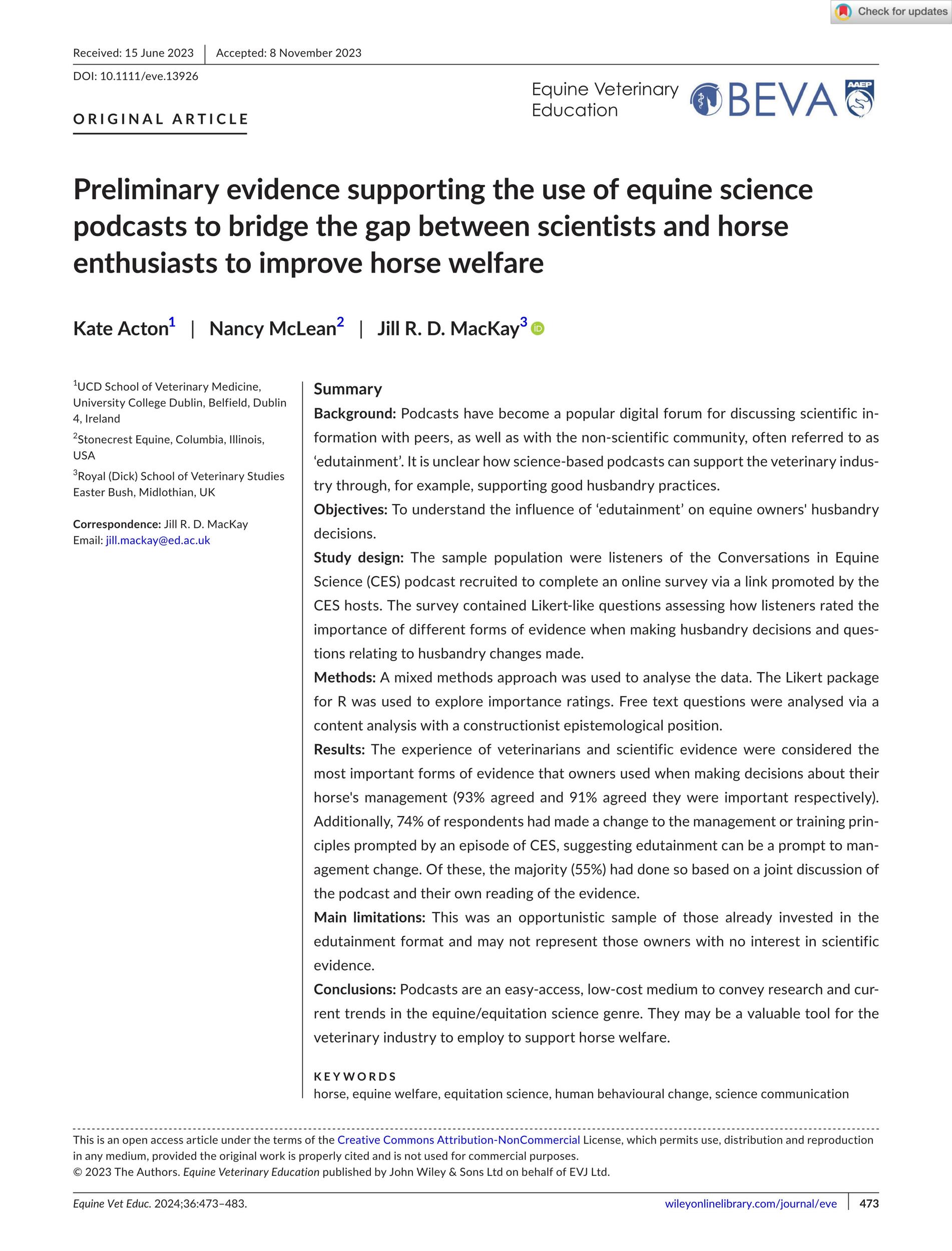 - Acton. K. et al., Preliminary Evidence Supporting the Use of Equine Science Podcasts to Bridge the Gap between Scientists and Horse Enthusiasts to Improve Horse Welfare. Equine Veterinary Education. 2024.