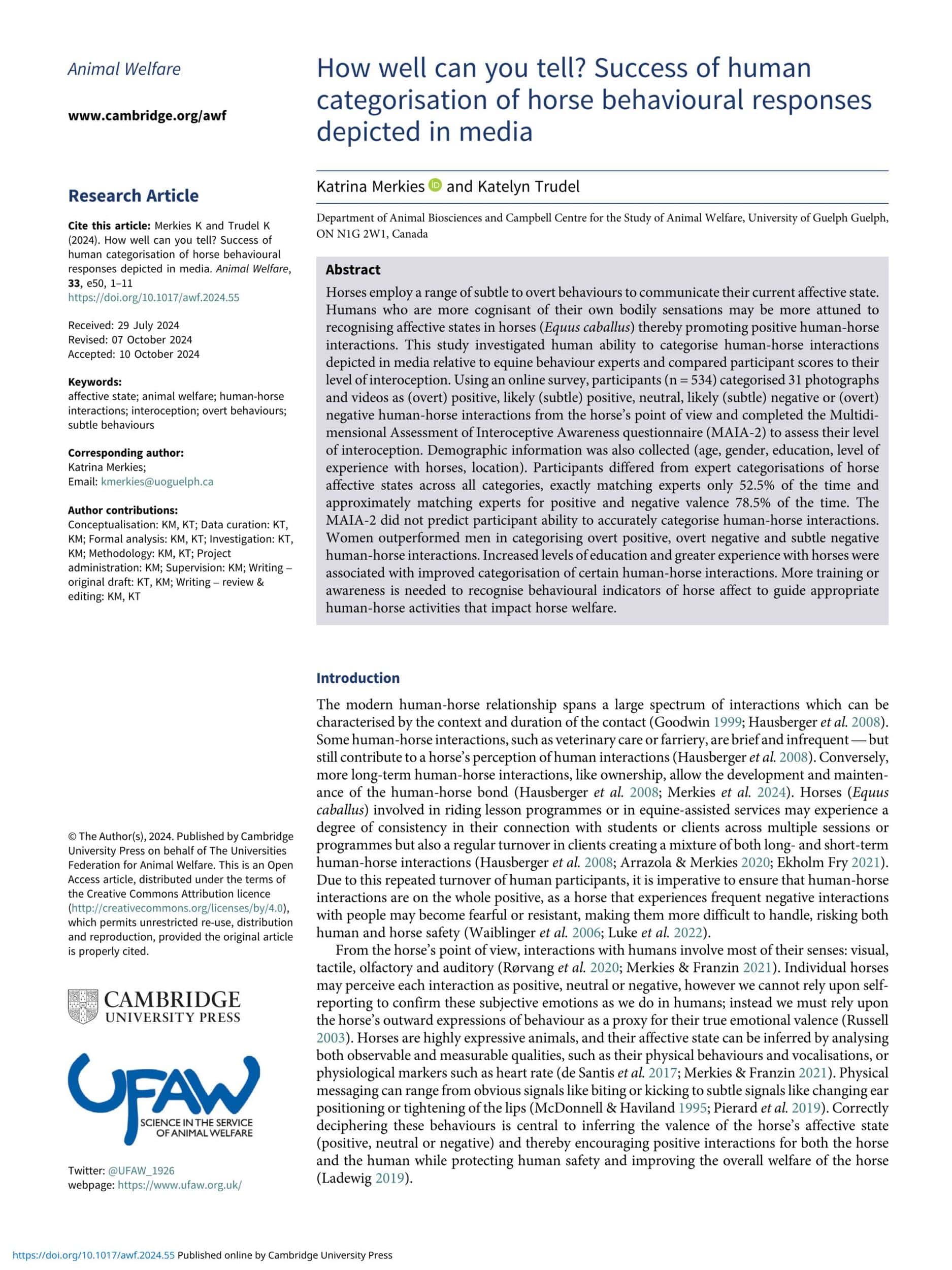 - Merkies. K. and Trudel. K., How Well Can You Tell? Success of Human Categorisation of Horse Behavioural Responses Depicted in Media. Animal Welfare. 2024.