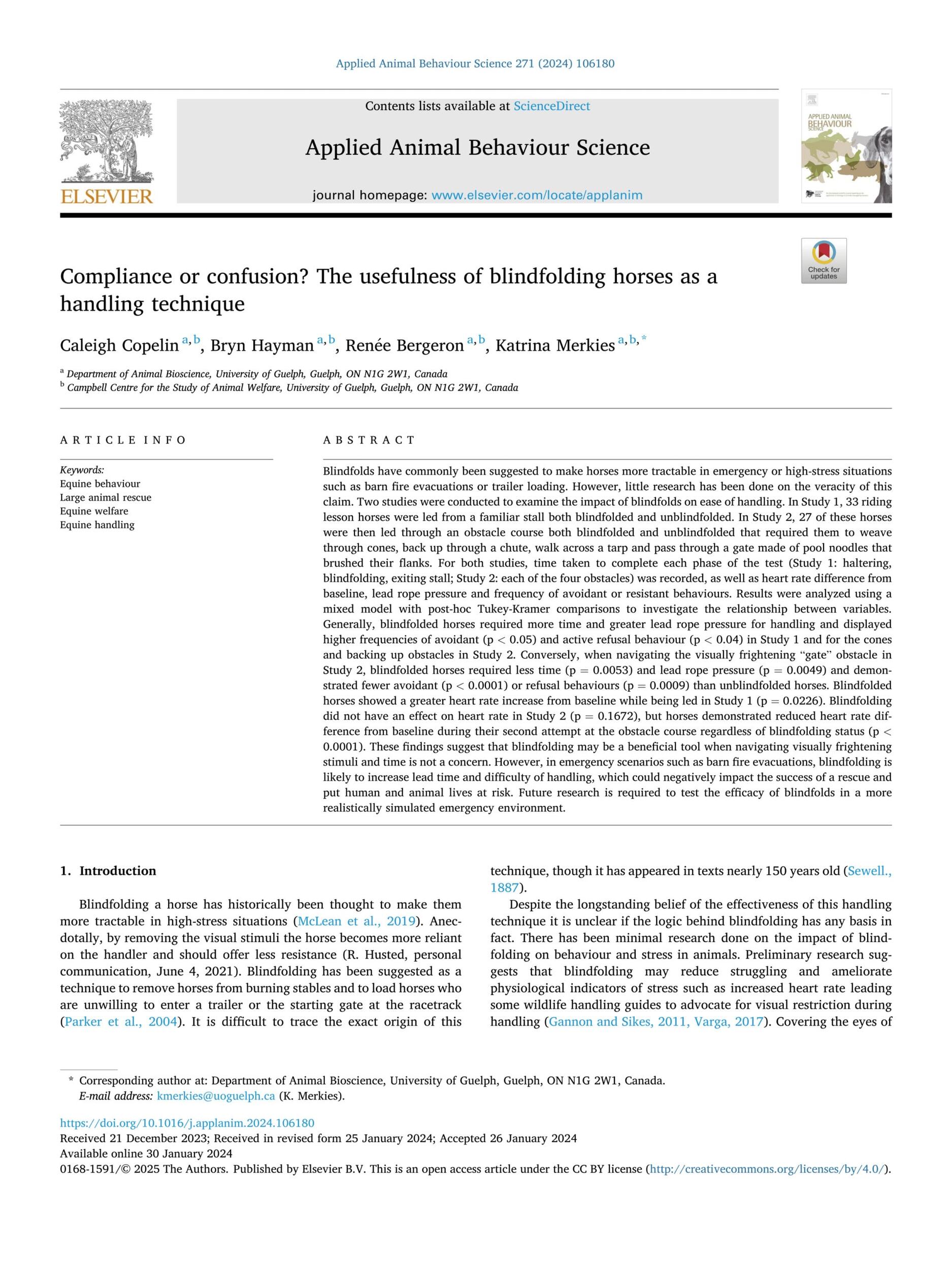 - Copelin. C. et al., Compliance or Confusion? The Usefulness of Blindfolding Horses as a Handling Technique. Applied Animal Behaviour Science. 2024.