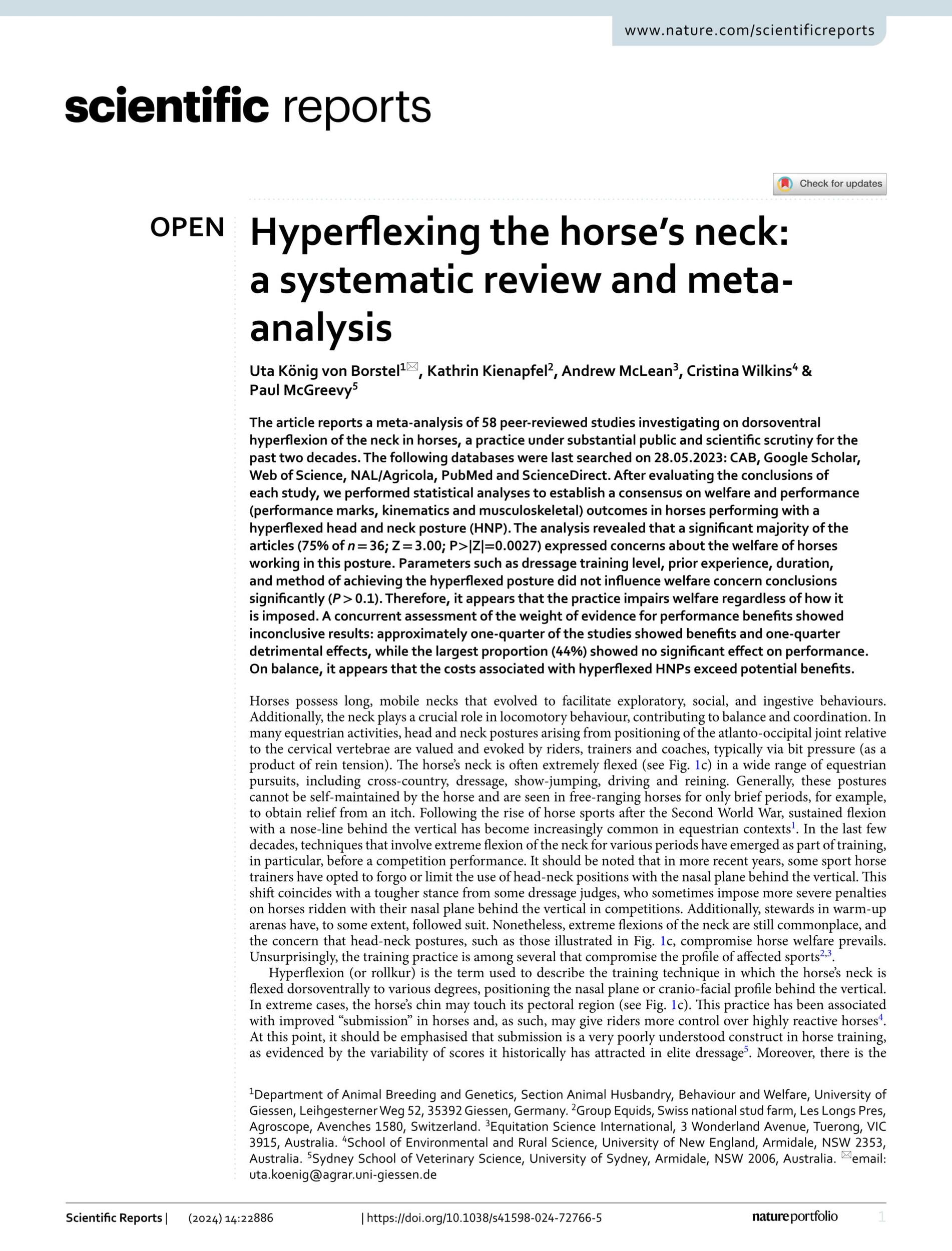 - König Von Borstel. U. et al., Hyperflexing the Horse’s Neck: A Systematic Review and Meta-Analysis. Scientific Reports. 2024. View Summary