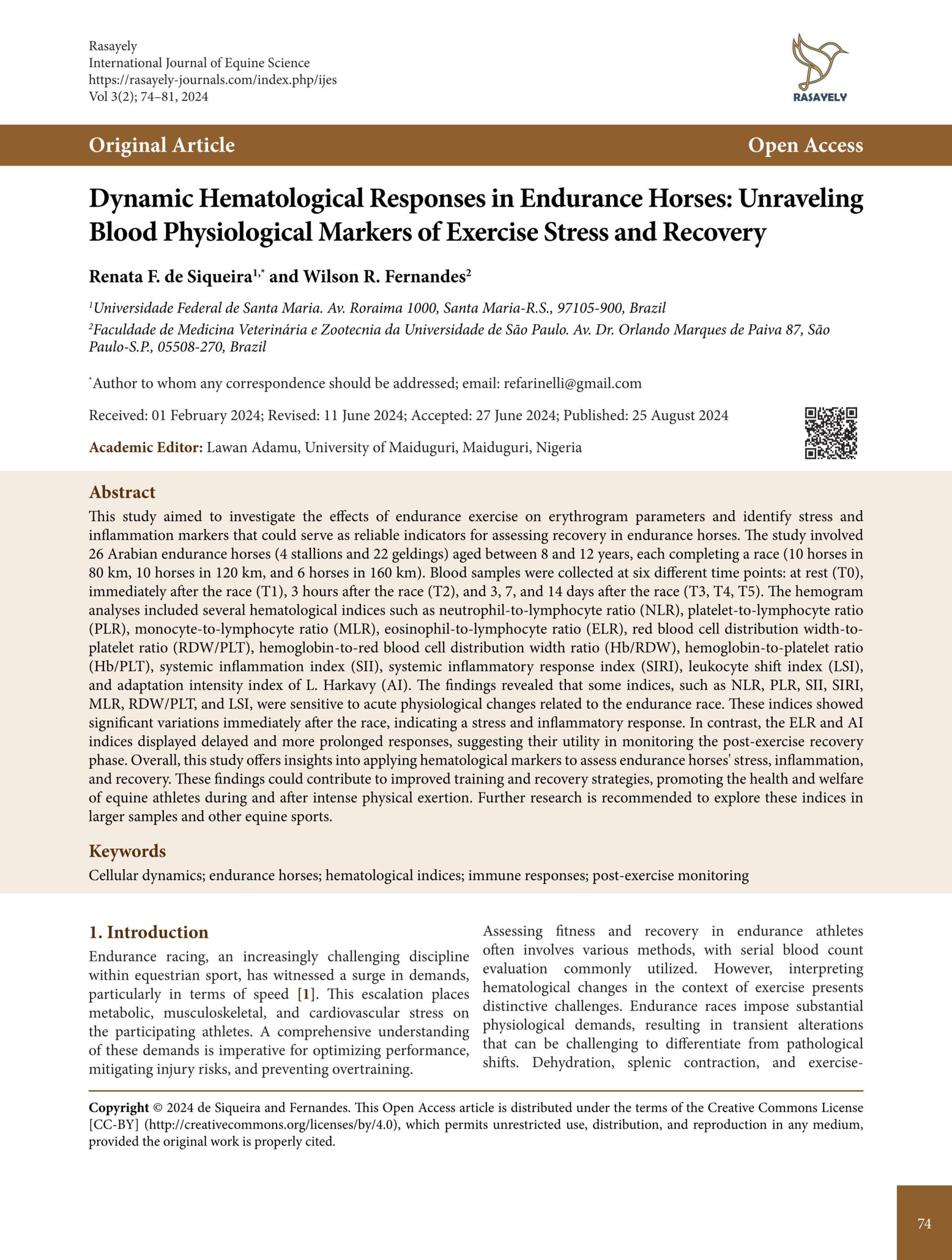 - de Siqueira,. R. F. and Fernandes,. W. R., Dynamic Hematological Responses in Endurance Horses: Unraveling Blood Physiological Markers of Exercise Stress and Recovery. International Journal of Equine Science. 2024.