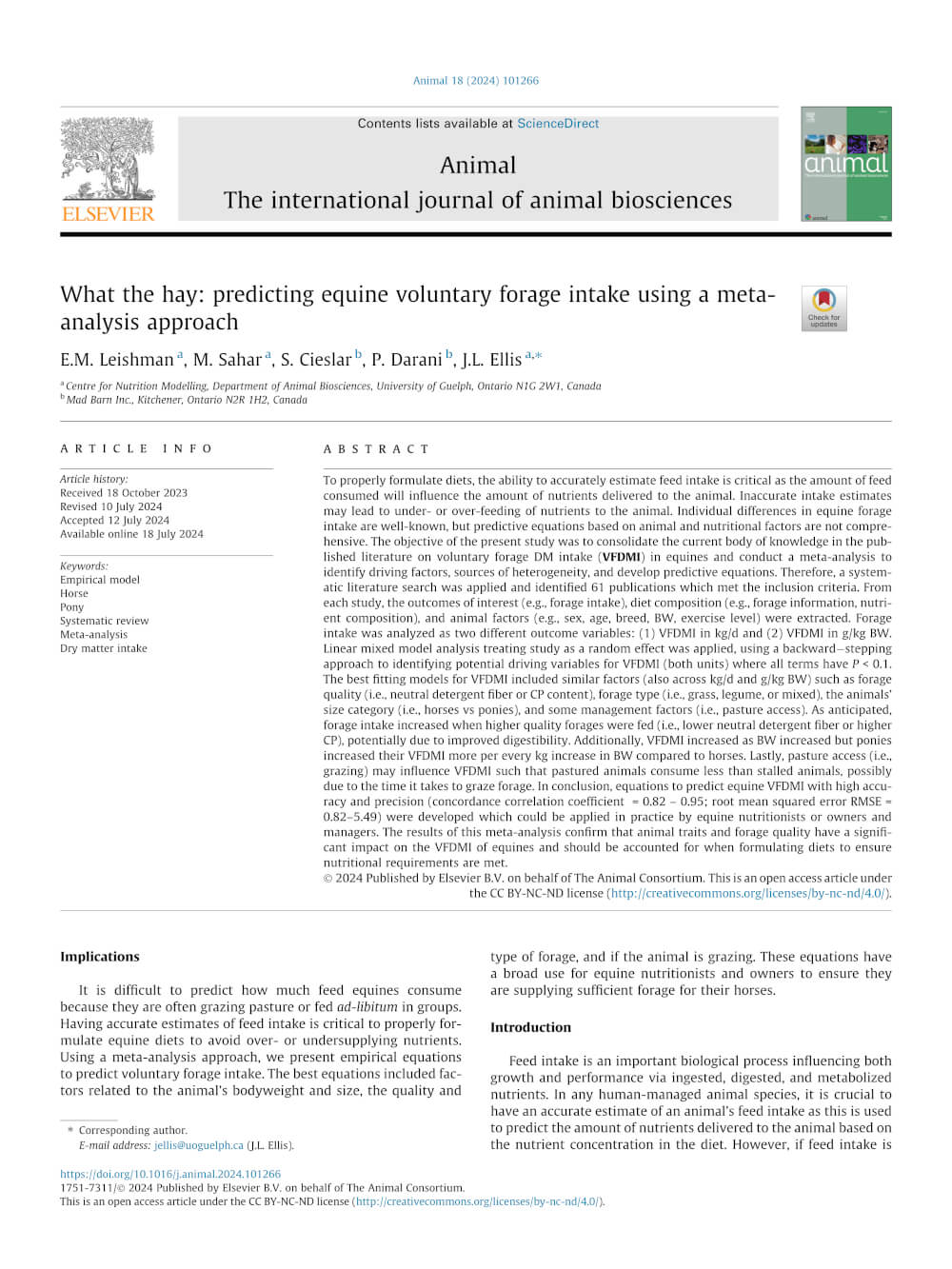- Leishman. E. M. et al., What the Hay: Predicting Equine Voluntary Forage Intake Using a Meta-Analysis Approach. animal. 2024. doi: 10.1016/j.animal.2024.101266.