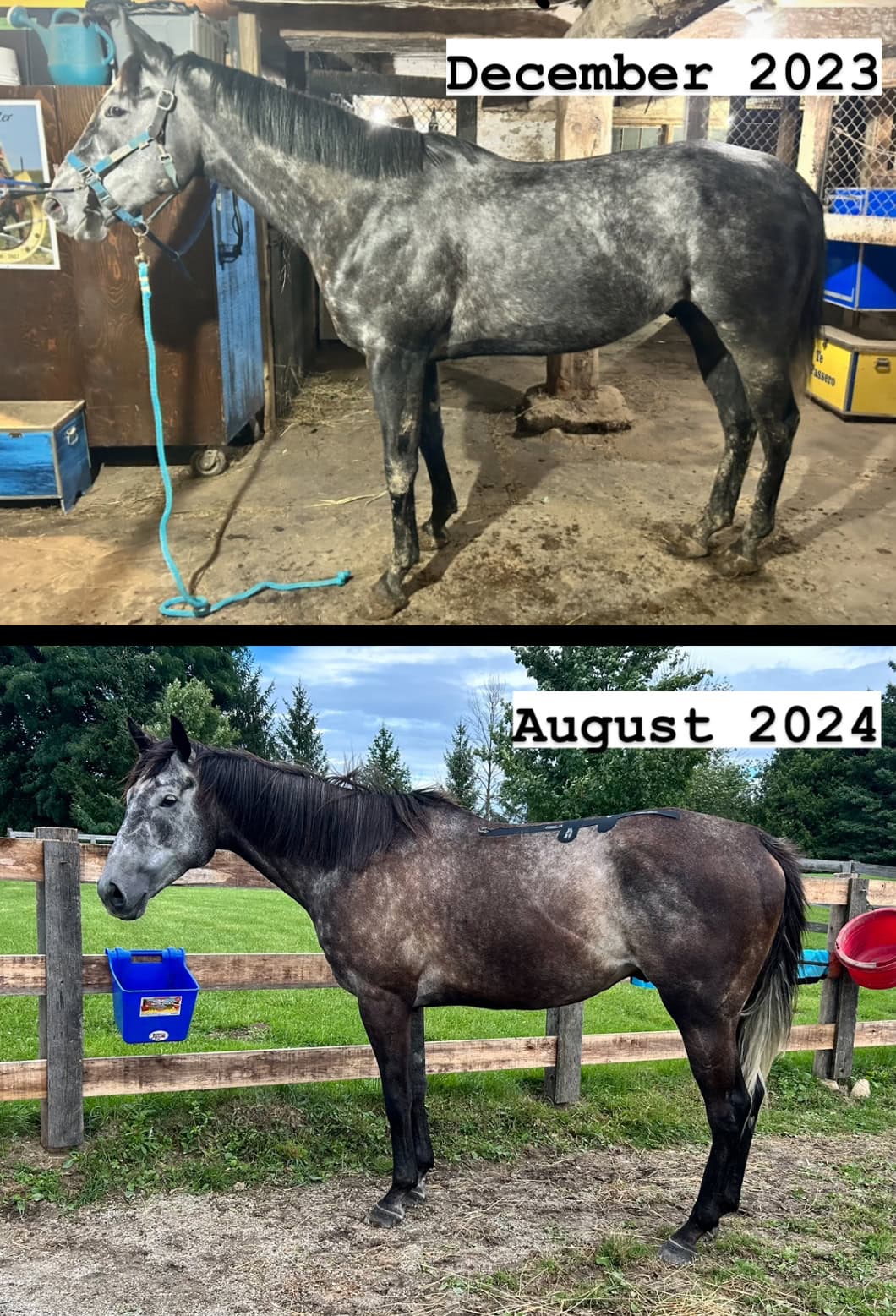 I would like to say how amazing your products are. My horse Sam is a prime example. Sam came to our barn underweight and sad. He had no energy and had pain. His coat was scruffy and dull. His tail was in bad shape. In May of last year I started him on Mad Barn Probiotic and Right Step Horse Mineral. Holy how he has flourished. He looks like a completely different horse thanks to your products. He has energy and has put on weight. His coat is beautiful and shiny and his tail has been growing in fabulously. I would like to say thank you. He’s a much happier and healthier horse. And he’s 21 years old. Here are some before and current pictures of him for proof. Thank you 😊