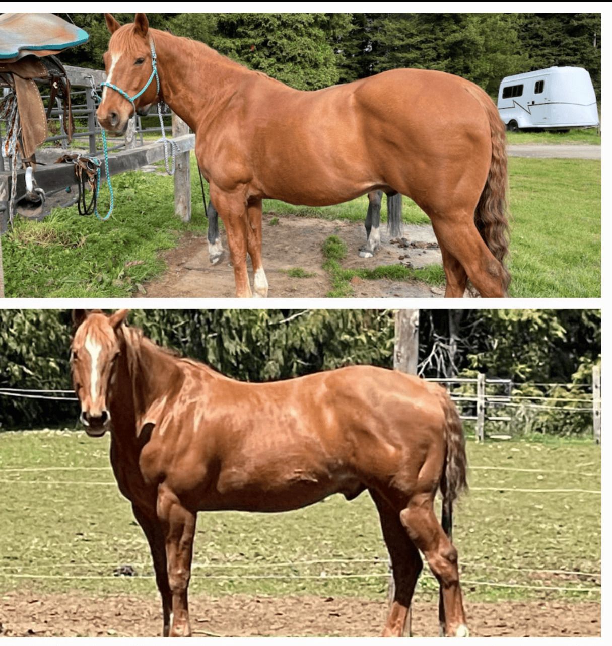 Thank you so much for supporting my mare’s health with your quality products. Photo of the month of April 2023 compared to August 2023, only 4 months since Julie Vigneault’s precious advice! Tired mare with insulin resistance, now at her healthy weight, finally! We continue our efforts 💪 Thank you very much for your excellent and ultra fast service, all my horses will continue to benefit from your products ❤️