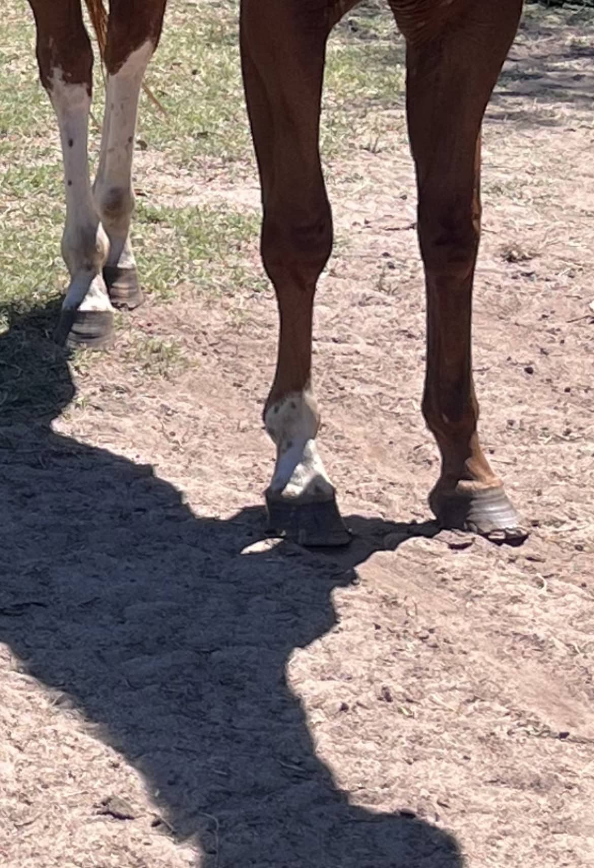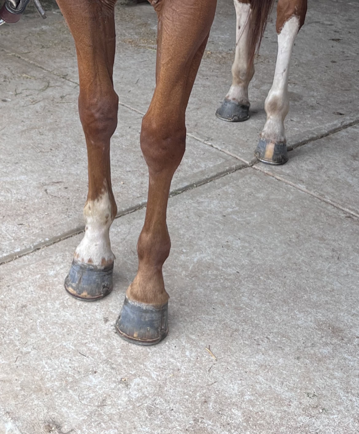 For a while, we were dealing with poor quality hooves with Ginger (coupled with inadequate farriery from someone I trusted). We had chronically underrun heels and the stereotypical “slipper feet”, with hooves that were too small for her size and cracks that the farrier determined needed to be dremeled out. I made a huge diet switch, changing to forage only, along with a new farrier. The difference was night and day. The Omneity allowed her to grow out a whole new hoof significantly faster than normal, and a much better, stronger foot. You can see a huge difference in the event lines too in the traditionally shod pictures vs the glue on shoe. Her feet became bigger, and she was much more comfortable moving around, going on to many successes in the show ring. Omneity was our saving grace!