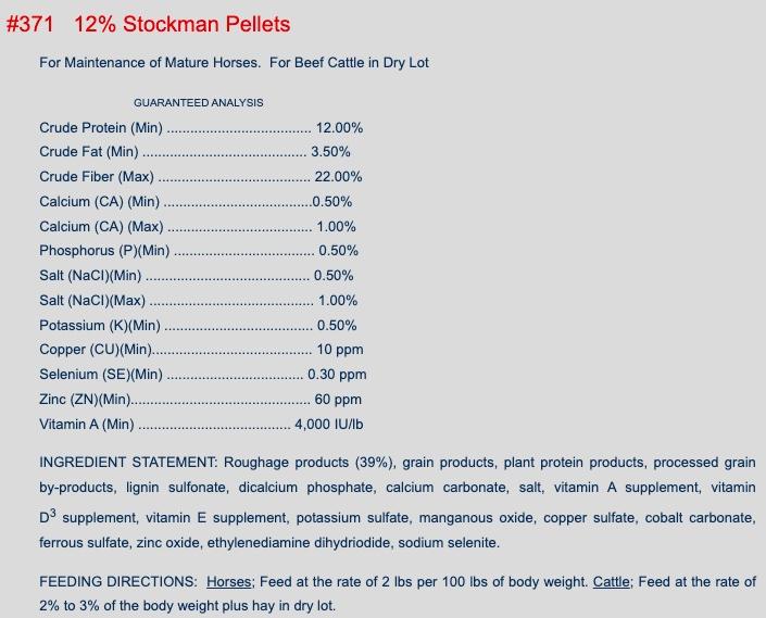 12% Stockman Pellets contains roughage and grain products, with 12% protein. This feed is suitable for mature horses at maintenance.