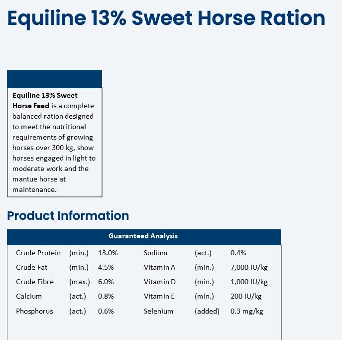 Equiline 13% Sweet Horse Ration is a textured feed designed for growing horses over 300kg/660lbs and working horses. It is higher in non-structural carbohydrates with the addition of molasses for palatability.