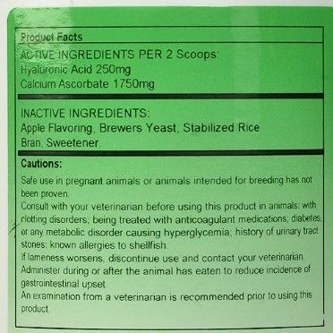 Ingredients: Hyaluronic Acid, Ascorbic Acid (Vitamin C Supplement), Apple Flavor, Brewers Yeast, Rice Bran, Sweetener