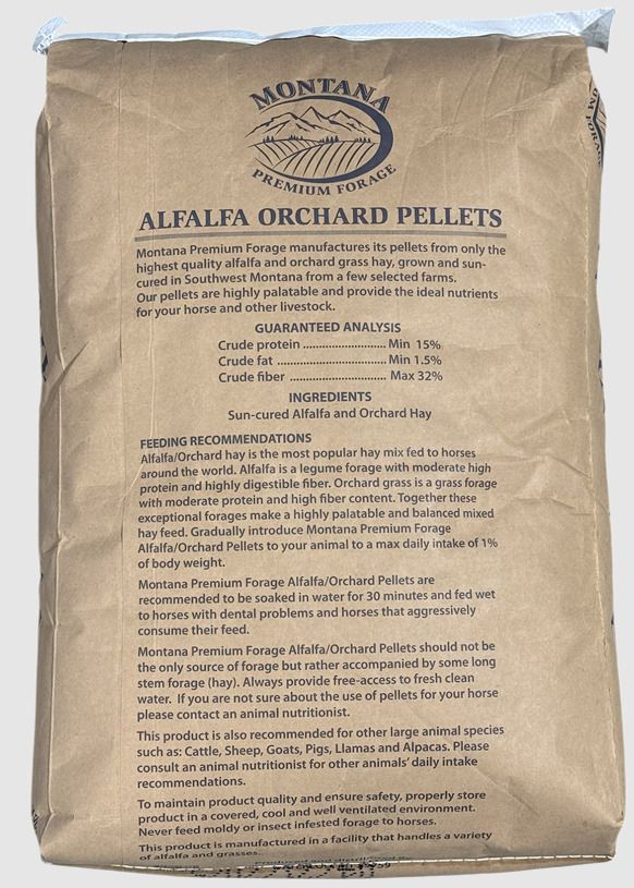 Alfalfa Orchard Pellets from Montana Premium Forage is a pelleted feed containing only orchard grass and alfalfa hay. It is high in fiber and is intended for horses in any stage.