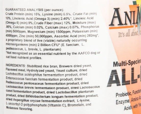 Ingredients: Rice Bran, Brewers Yeast, Ground Flaxseed (Linseed), Hydrolyzed Yeast, Yeast Culture, Dried Lactobacillus acidophilus Fermentation product, Dried Enterococcus faecium Fermentation Product, Dried Pediococcus pentosaceus Fermentation Product, Dried Lactobacillus brevis Fermentation Product, Dried Lactobacillus casei Fermentation Product, Dried Lactobacillus plantarum Fermentation Product, Dried Bifidobacterium longum Fermentation Product, Dried Aspergillus oryzae Fermentation Product, L-Lysine, L-Ascorbyl-2-Polyphosphate (Vitamin C), Bromelain, Molasses