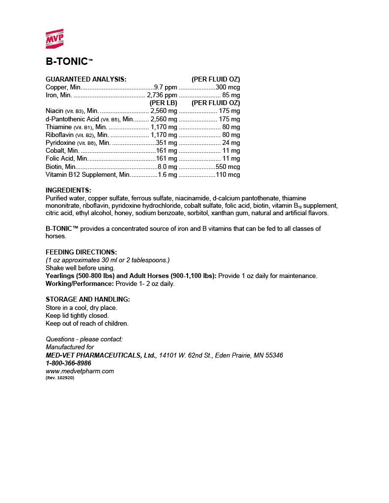 B-Tonic by MVP is a liquid supplement that contains B Vitamins and iron that intend to help support the production of hemoglobin in red blood cells. It intends to correct deficiencies, stimulate appetites and help nervous horses.