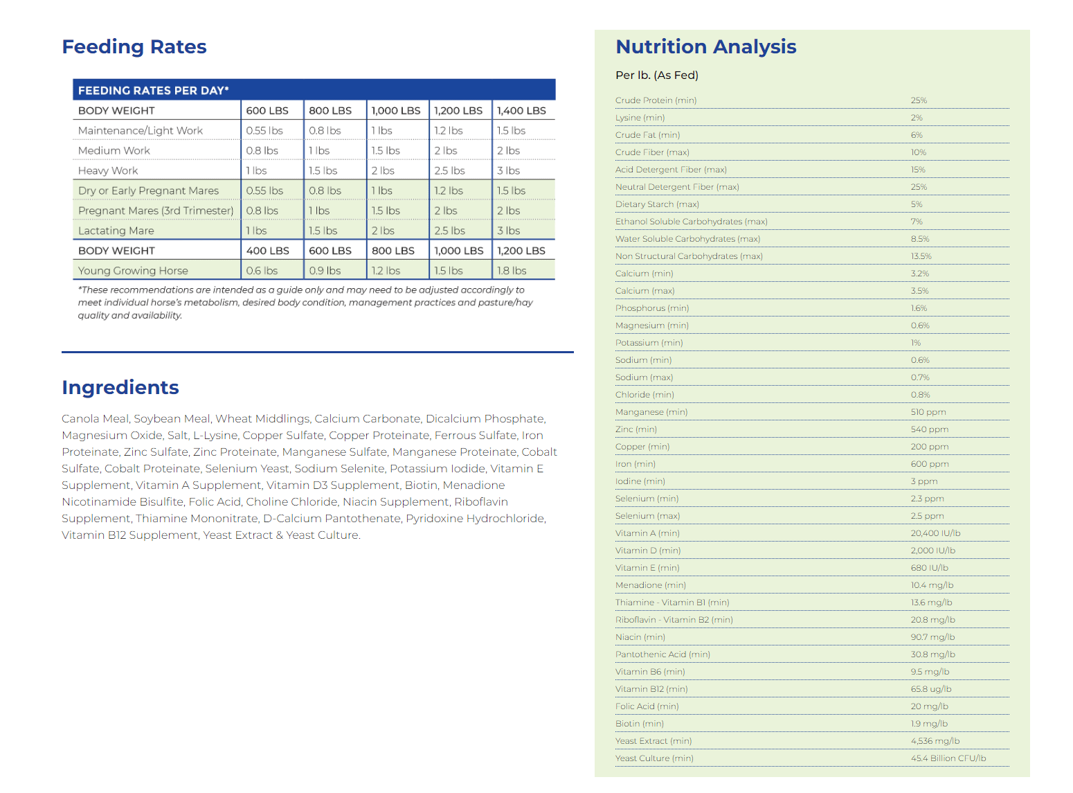 | SulfurSulfur is a component of the amino acids methionine and cysteine. It is important for hoof health, joint function, coat quality and metabolic health. | -- | % DM | -- | g | ||
