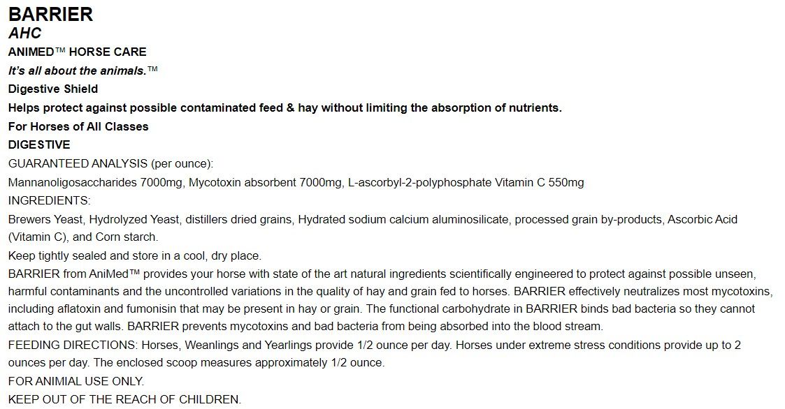 AniMed's Barrier aims to help protect the digestive tract from potentially contaminated feed or hay while still allowing the proper absorption of nutrients. The goal of this supplement is to neutralize mycotoxins to prevent them from being absorbed into the bloodstream.