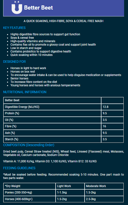 Better Beet is a feed for horses and ponies of all ages and work levels. It contains highly digestible sources of fiber, which supports gut health. It contains 9.5% protein, 3.5% fat, and 16% fiber.