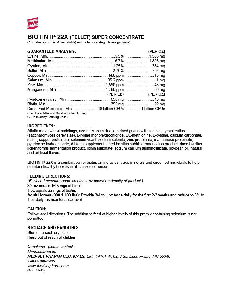 Biotin II 22X Pellets by MVP is a supplement intended for horses of all life stages that contains a combination of biotin, amino acids, trace minerals and probiotics that intends to help maintain hooves and support growth and repair.