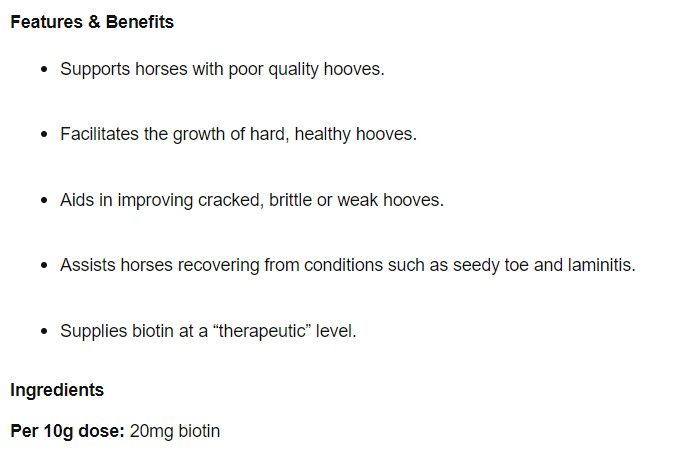 BiotinMAX Concentrate from Kelato is a powdered supplement that contains the ingredient biotin. This supplement aims to help with hoof health, support, and growth. It can also assist horses recovering from laminitis.