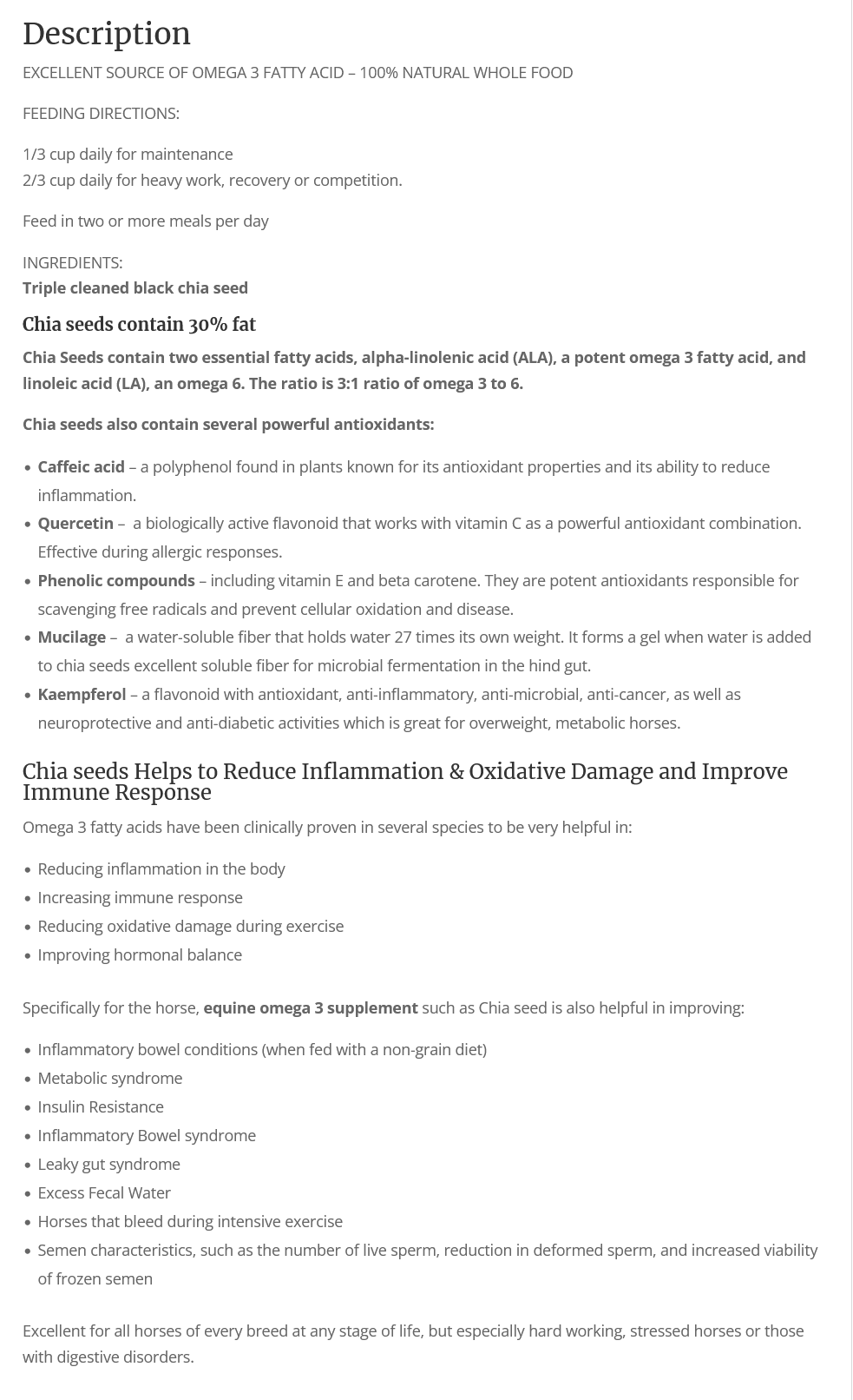 Black Chia Seed by Equi-Force is a omega-3 supplement intended to support immune and gut health. It is ideal for performance horses but suitable for all horses.