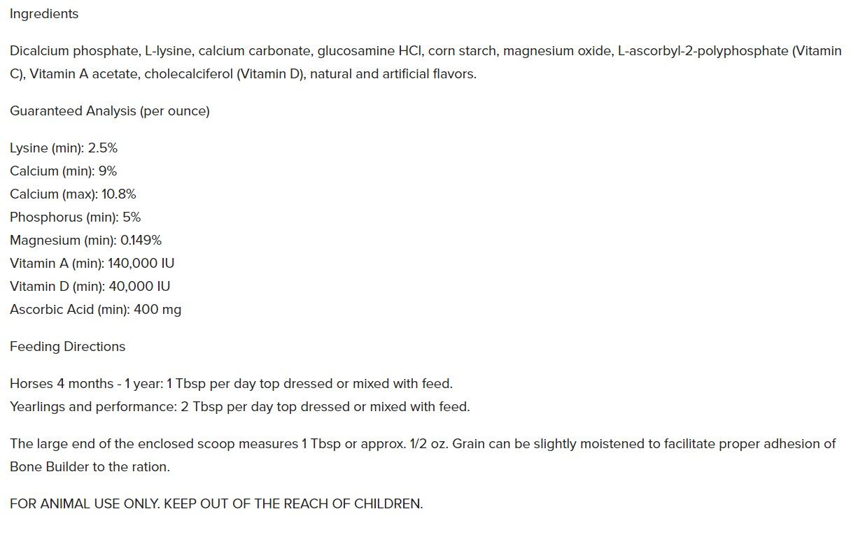 AniMed's Bone Builder is a supplement that provides nutrients in balanced and sufficient amounts. It is meant to help achieve strong bones in young and growing horses and also for equine athletes.