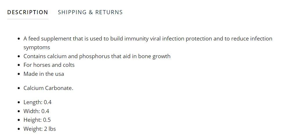 | SulfurSulfur is a component of the amino acids methionine and cysteine. It is important for hoof health, joint function, coat quality and metabolic health. | -- | % DM | -- | g | ||