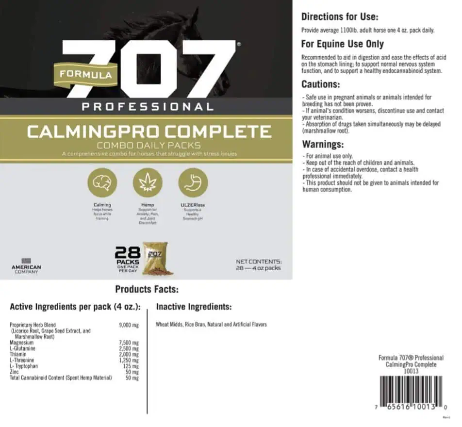 Calming Pro Complete from Formula 707 is a pelleted calming supplement. It is meant to support digestion, stomach health, and nervous system health.
