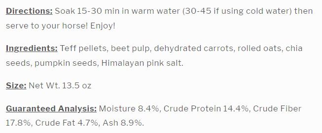 Ingredients: Teff Grass Hay, Beet Pulp, Carrots, Oats, Chia Seeds, Pumpkin Seed, Salt (Sodium Chloride)