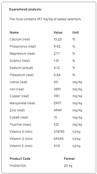 Ingredients: Monocalcium Phosphate, Calcium Carbonate, Salt (Sodium Chloride), Potassium Sulfate, Magnesium Sulfate, Magnesium Oxide, Yeast Culture, Vitamin A Supplement, Vitamin D Supplement, Vitamin K Supplement, Vitamin E Supplement, B Vitamins, Manganese Proteinate, Copper Proteinate, Zinc Proteinate, Iodine Supplement, Manganese Oxide, Zinc Oxide, Copper Sulfate, Cobalt Carbonate, Vegetable Oil, Polyphenols, Canola Meal, Selenium Yeast, Choline Chloride, Flavor, Anti-Caking Agent