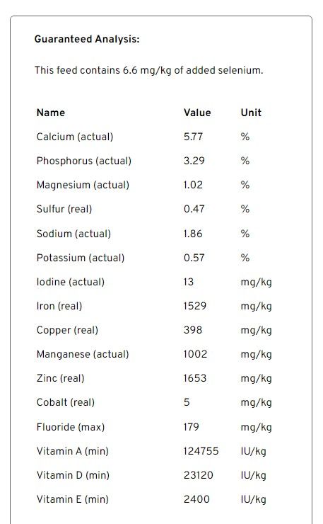 | SulfurSulfur is a component of the amino acids methionine and cysteine. It is important for hoof health, joint function, coat quality and metabolic health. | 0.49 | % DM | (act) | 4.66 | g | |