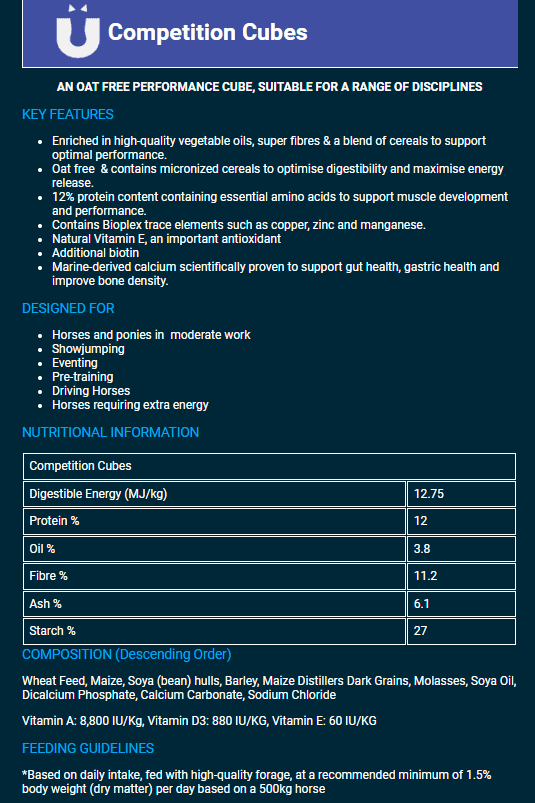 Competition Cubes is an oat-free formula for horses and ponies in moderate work and performance horses. It contains biotin to support hoof health, micronized cereals to support gut health, and Vitamin E to support immunity.