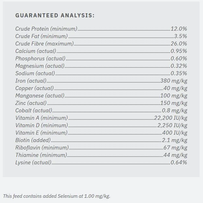 Disclaimer: Listing of a product in the Feed Bank does not imply endorsement or approval by Mad Barn. Products listed are not sold by Mad Barn and should not be construed as product offerings. All trademarks are the property of their respective owners. Although we endeavour to maintain the accuracy of nutritional information in our feed bank, the nutrient analysis may not be complete or accurate based on available information. Users are advised to use this information at their discretion and are encouraged to consult with professional nutritionists or a veterinarian for any specific recommendations or advice.