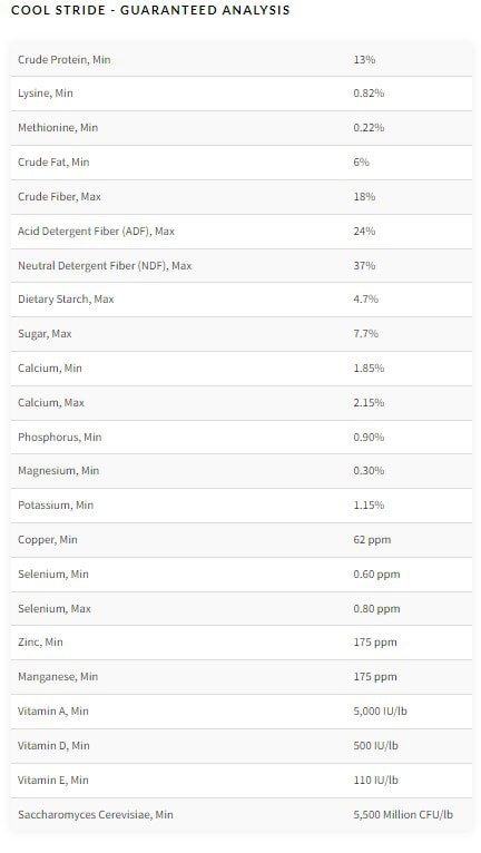 Cool Stride is a low NSC (12.4%) textured horse feed intended for easy keepers and boarding facilities. It contains added calcium meant to buffer stomach acid and added chromium meant to support metabolic health.