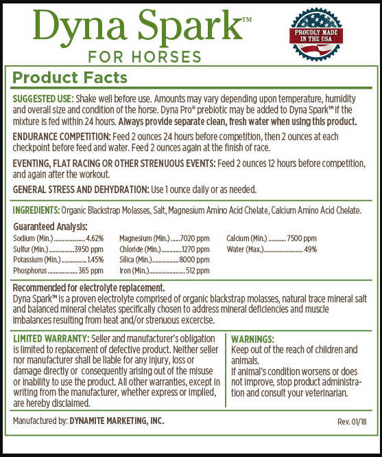 Dyna Spark from Dynamite is a liquid electrolyte supplement that is intended for performance horses. It contains minerals and molasses and is also meant to help with recovery.