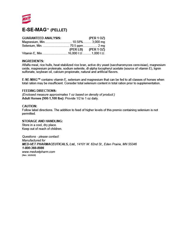 E-SE-MAG Pellets by MVP is a supplement for horses that contains vitamin E, selenium and magnesium. It intends to support efficient muscle function and manage exercise-associated muscle discomfort.
