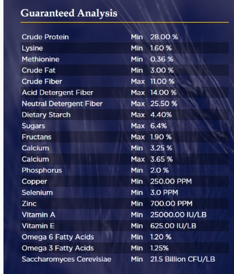 | Soluble FiberSoluble fibers are easily digestible by the horse. They are broken down into sugars and absorbed from the gut. | 4.5 | % DM | (est) | 18.2 | g | |