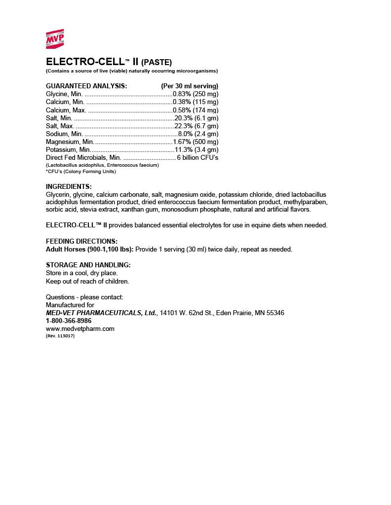 Electro-Cell by MVP is a paste horse supplement that intends to provide balanced essential electrolytes for use during dehydration, heat, or stress. It contains ingredients such as glycine, calcium carbonate, and salt.