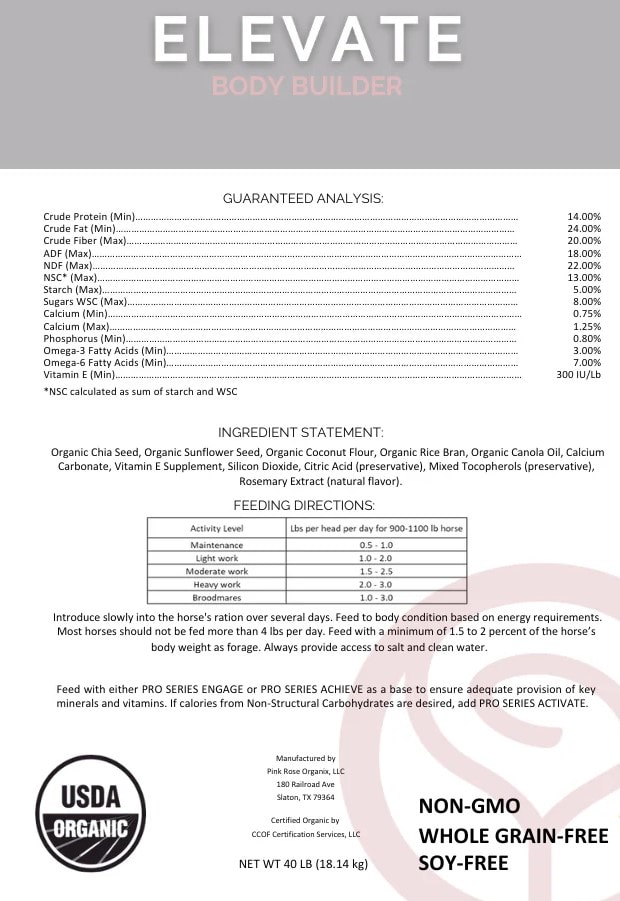 Elevate Body Builder from Pink Rose Organix is an additive that is high in fat and is meant to provide cool energy with low sugars and starch. It is also intended for horses in heavy work or hard keepers.