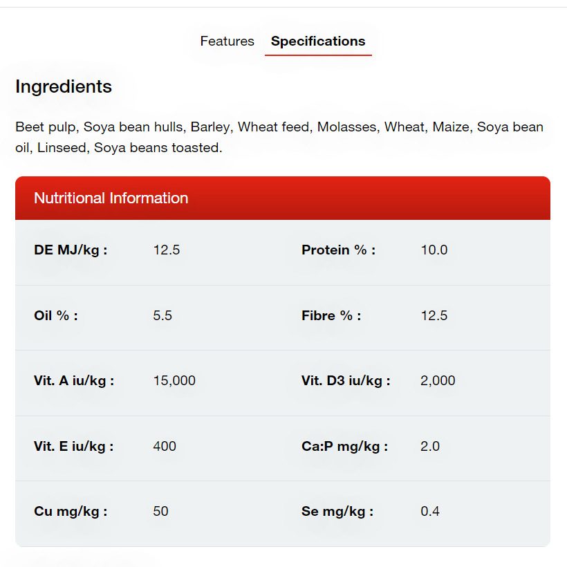 Ingredients: Beet Pulp, Soybean Hulls, Barley, Wheat Middlings (Shorts), Molasses, Wheat, Maize, Soybean Oil, Flaxseed (Linseed), Soybeans