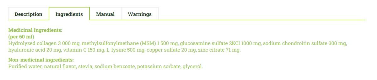 Ingredients: Hydrolyzed Collagen, Methylsulfonylmethane (MSM), Glucosamine Sulfate, Chondroitin Sulfate, Hyaluronic Acid, Ascorbic Acid (Vitamin C Supplement), L-Lysine, Copper Sulfate, Organic Zinc, Water, Natural Flavors, Stevia Extract, Benzoic Acid, Potassium Sorbate, Glycerine