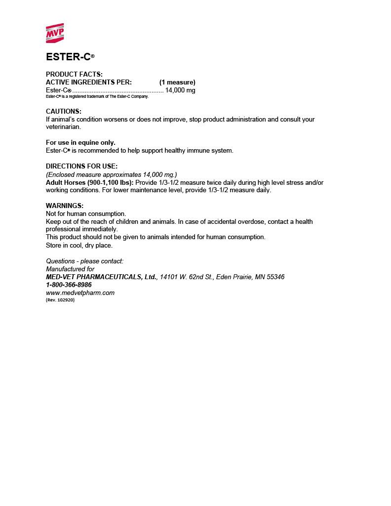 Ester-C by MVP is a powdered supplement for horses made of pure vitamin C that intends to support the immune system. Vitamin C is an antioxidant that may promote collagen synthesis and reduces oxidative stress.