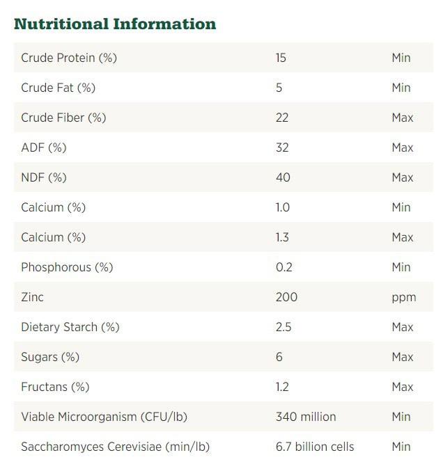 Ingredients: Alfalfa Hay, Beet Pulp, Canola Oil, Yeast Culture, Calcite, Hydrolyzed Yeast, Natural Flavors, Butyric Acid, Zinc Oxide, Saccharomyces cerevisiae Yeast Culture, Calcium Carbonate, Dried Bacillus subtilis Fermentation Product, Mineral Oil, Dried Bacillus licheniformis Fermentation Product