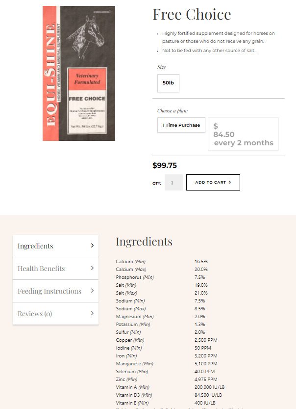 Free Choice by Doctor's Choice Supplements is a vitamin and mineral supplement intended for horses strictly on pasture or forage. It contains ingredients such as calcium carbonate, salt, and monocalcium phosphate.